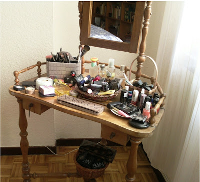 Toda mi casa luce tan impoluta que cualquier invitado podría creer que el orden es mi punto fuerte... pero mi tocador revela el caos que realmente me caracteriza: así apareció a los ojos de mi madre el día en que aterrizaba en La Rioja. Nada más verlo quiso sentarse ante él para rebuscar, pues venía necesitada de alguna sombra de ojos y algún pintalabios.